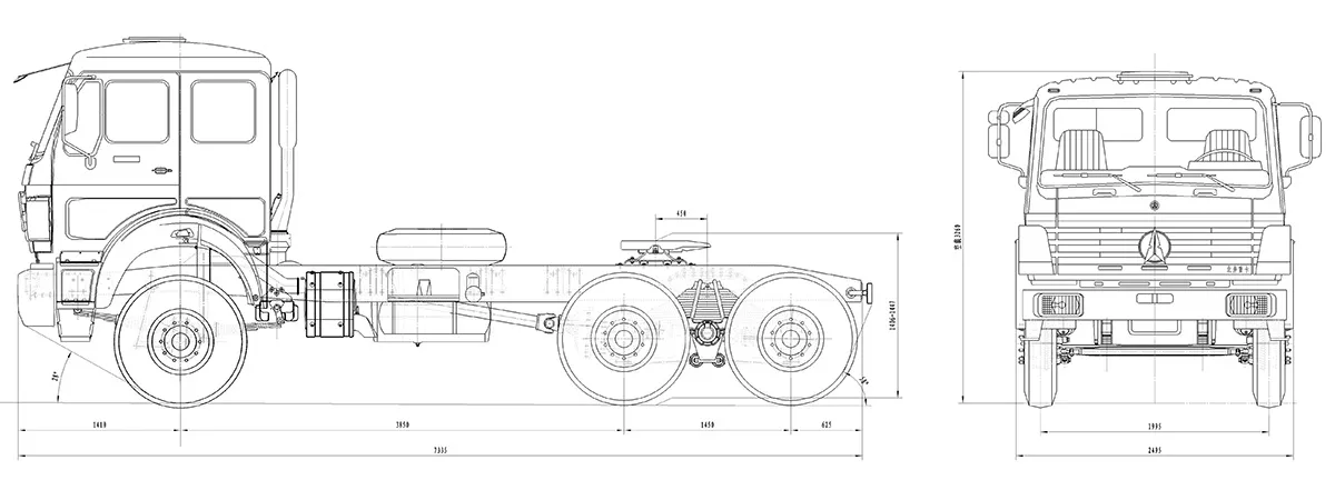 Dimensiones | Distancia entre ejes (WB): 3850+1450mm Longitud total (OL): 7500mm Ancho total (OW): 2495mm Altura total (OH): 3280mm Voladizo delantero (FOH): 1435mm Voladizo trasero (ROH): 625mm Radio de montaje delantero del semirremolque: 2900mm Radio de montaje trasero del semirremolque: 2300mm | |